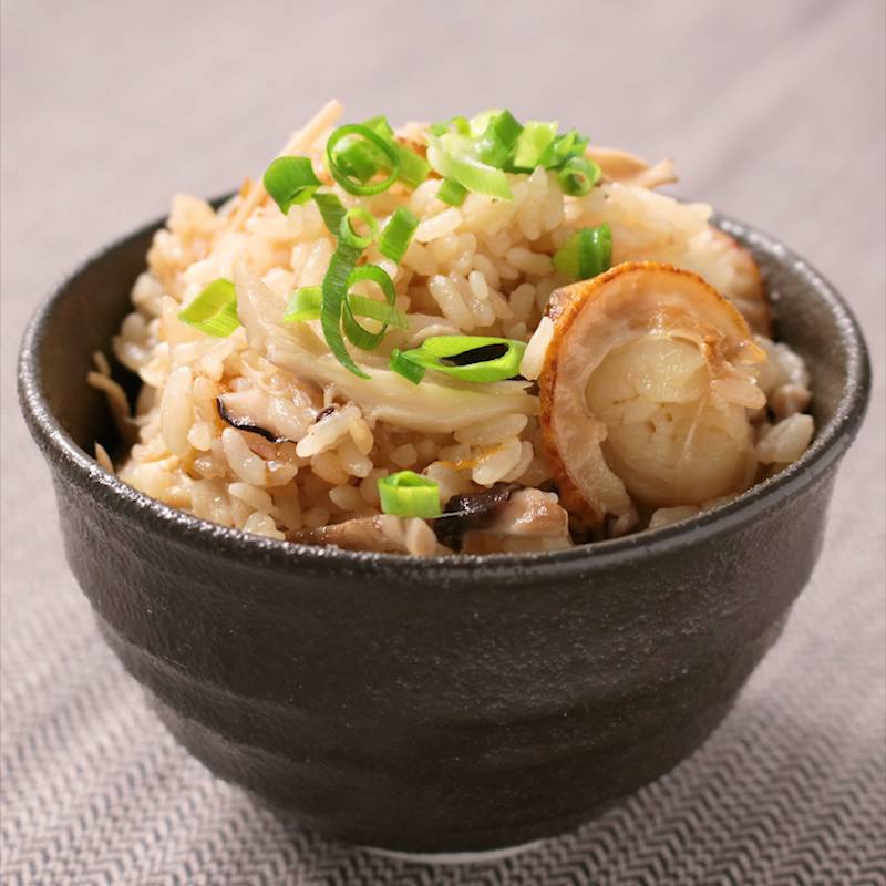 3つ目は、ホタテの炊き込みご飯です。 お米と一緒に、少量の醤油、酒、みりん、そしてホタテを入れて炊き上げます。炊きあがった瞬間、炊飯器から広がる海の香りはたまりません。ホタテから出る出汁が、お米一粒一粒に染み渡ります。お好みでお好きなキノコ類を加えて♪