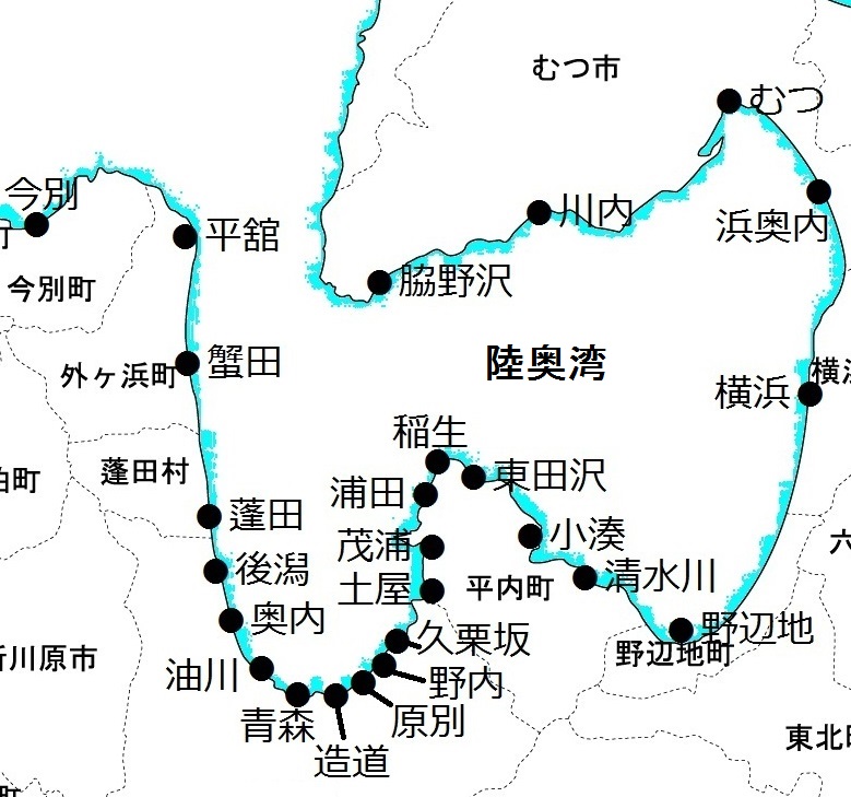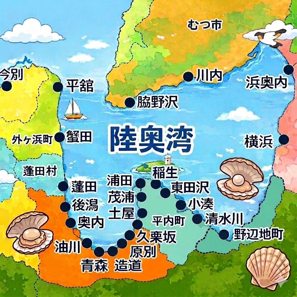 陸奥湾は「東湾」と「西湾」に分けられ、それぞれの沿岸に多くの漁港が点在しています。