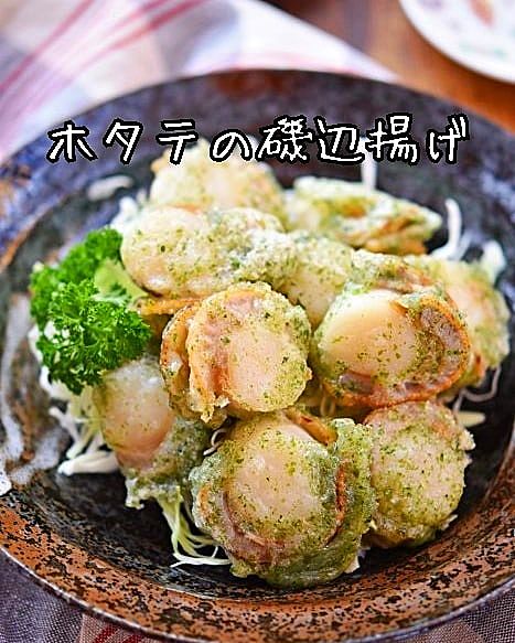 4つ目は、ホタテの磯辺揚げです。 天ぷら粉に青のりを混ぜ、ホタテにさっとつけて揚げます。外はサクッ、中はもっちり。お子様からお年寄りまで喜ばれる一品です。